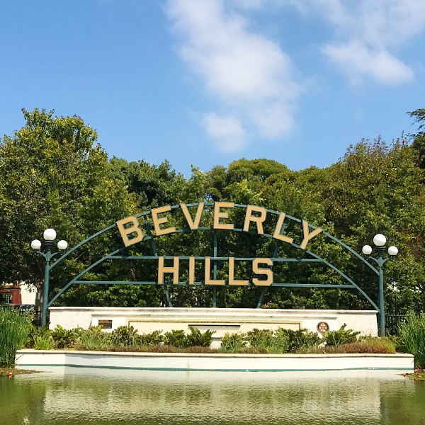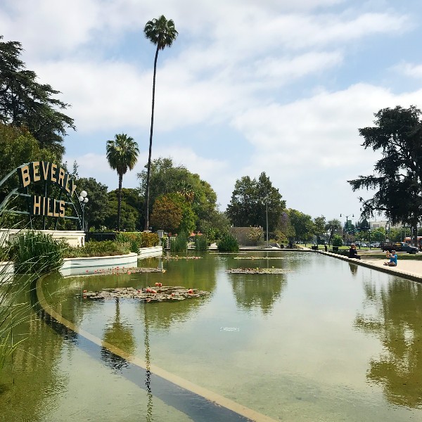 One block east of Rodeo Drive, at the corner of Beverly Drive & Santa Monica Blvd in Beverly Gardens Park, the large, photogenic Beverly Hills sign sits on display above the beautiful Lily Pond.
