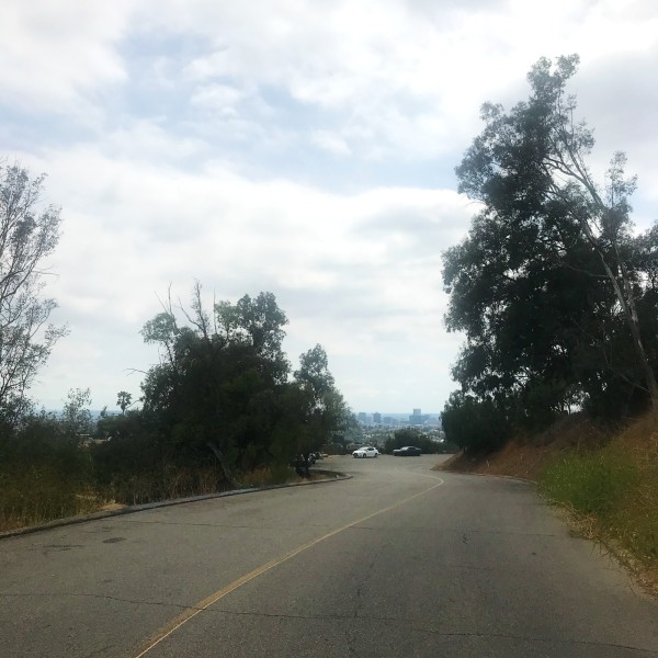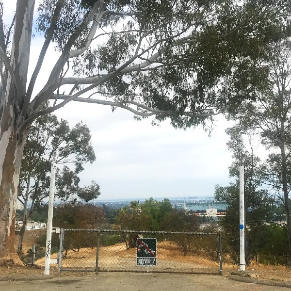 This perfect lookout point is located roughly 50 yards up the road from “Angels Point”, which GPS will recognize (there is no physical address). Look for the two white concrete poles pictured below, then follow the dirt path forward to where you’ll clearly see the overlook, with the stadium, police academy, city hall, and Downtown LA skyline below & beyond.